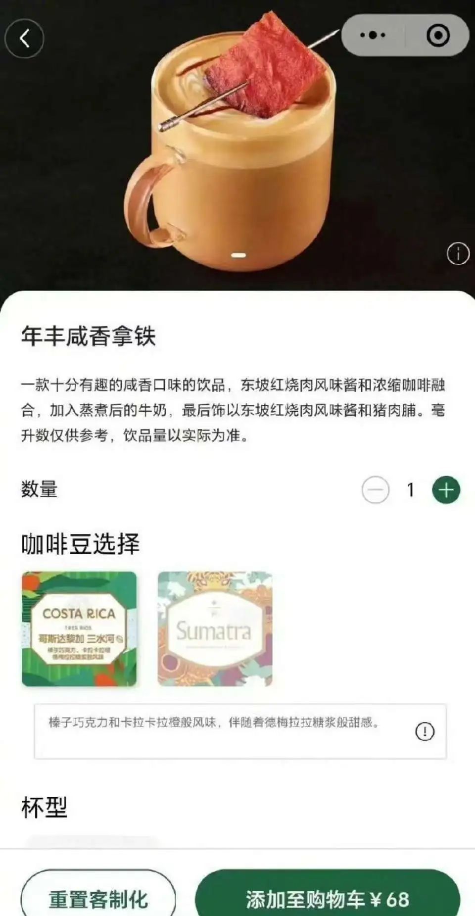 秉捏一样出圈想路的还有星巴克的年丰咸香拿铁,也即是据说中的“红烧肉拿铁”,据说饮品由“东坡红烧肉风姿酱和浓缩咖啡会通,加入蒸煮后的牛奶,终末饰以东坡红烧肉风姿酱和猪肉脯”,售价高达68元。